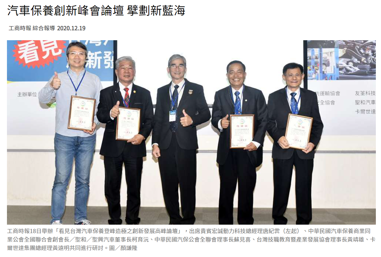 2020看見台灣汽車保養登峰造極之創新發展高峰論壇,由工商時報、台北市汽車保養商業同業公會、新北市汽車保養商業同業公會、全聯會各縣市汽車保養商業同業公會、社團法人新北市公共運輸協會、台灣空氣品質健康安全協會、宏誠動力科技、友筌科技實業(股)公司、聖和汽車(股)公司、卡爾世達集團合辦,12月18日在時報總部舉行,商發院商業發展與策略研究所所長黃兆仁擔任主持人,中華民國汽保公會全聯會理事長蔡見喜、台灣技職教育暨產業發展協會理事長黃靖雄受邀致詞。